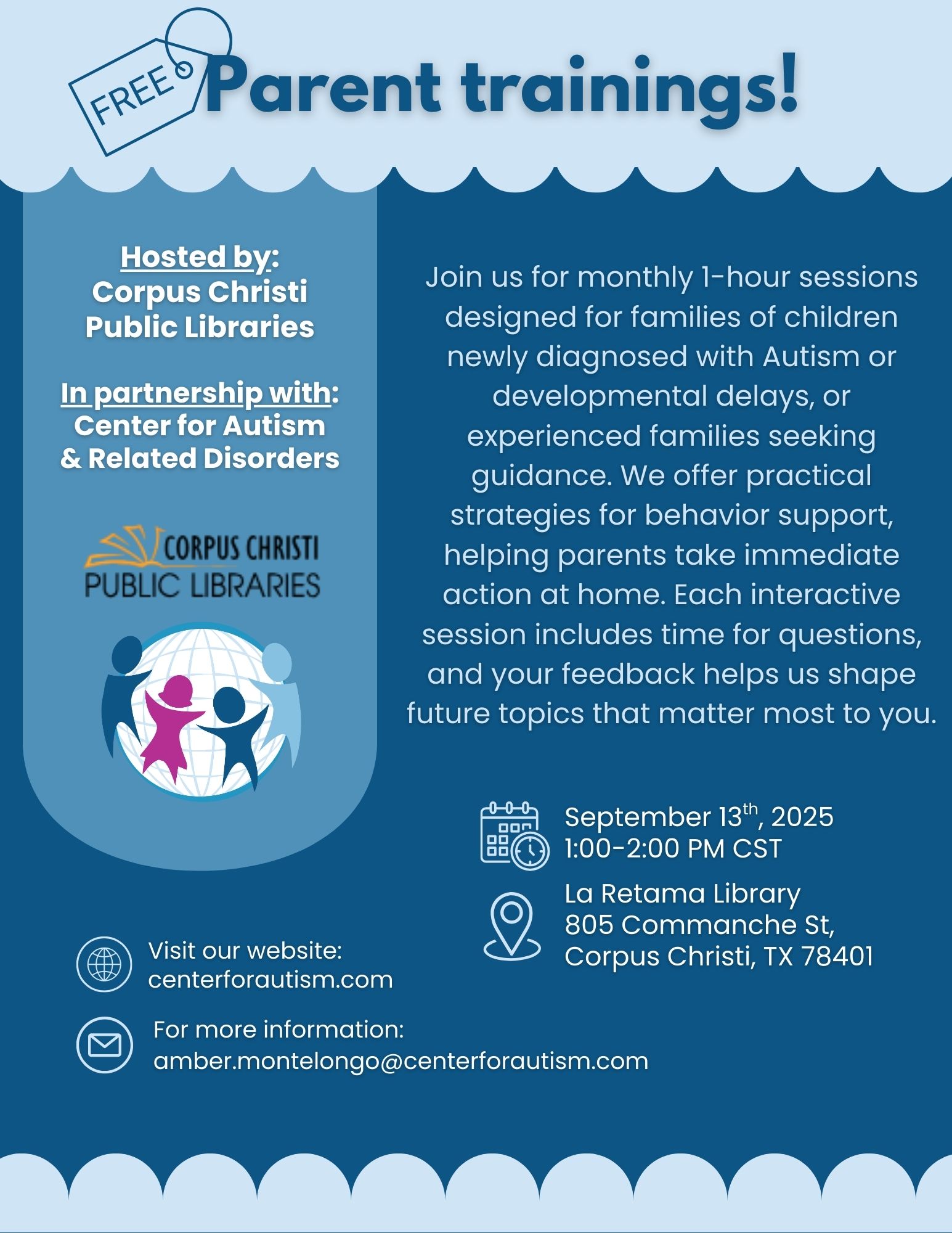 Join us for Parent Trainings at the Corpus Christi Public Libraries on Saturday, Sept 13th at 1pm CST. Gain tools, strategies, and support to help your child thrive at home, in school, and in the community.