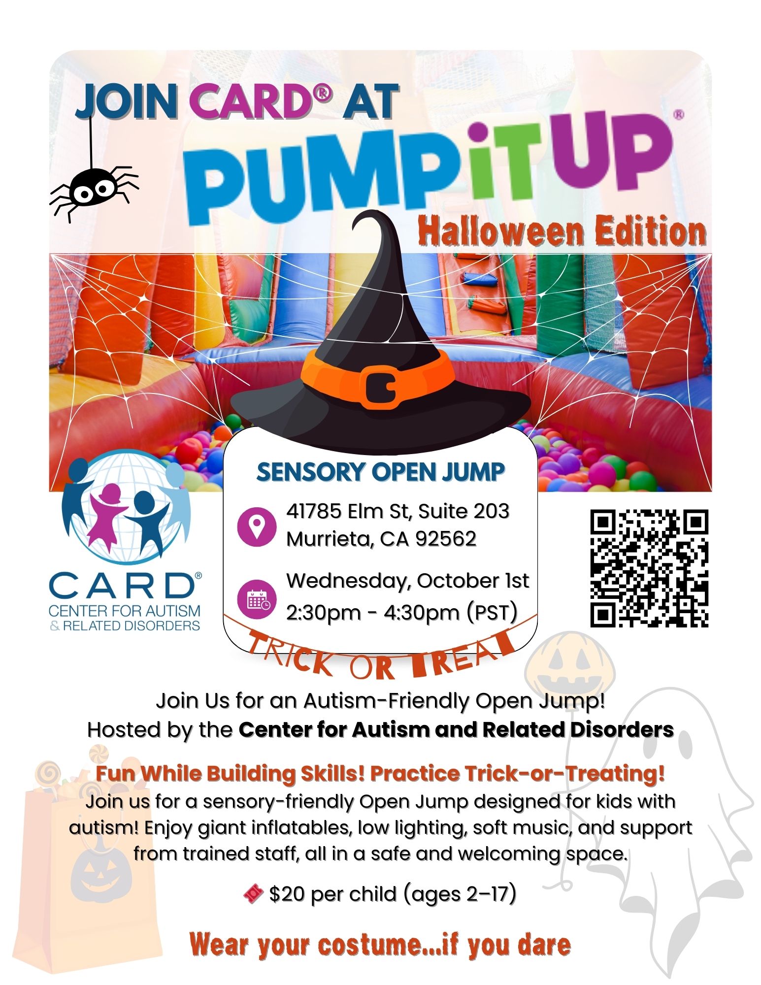 Halloween Fun with CARD! Join us for a special Halloween edition Open Sensory Jump at Pump It Up Murrieta! Wednesday, October 1, 2025 12:15 PM Pump It Up, Murrieta Kids can: Jump and play in a sensory-friendly space Build skills through fun activities Practice trick-or-treating in a safe, welcoming environment Don’t miss this spooktacular event!