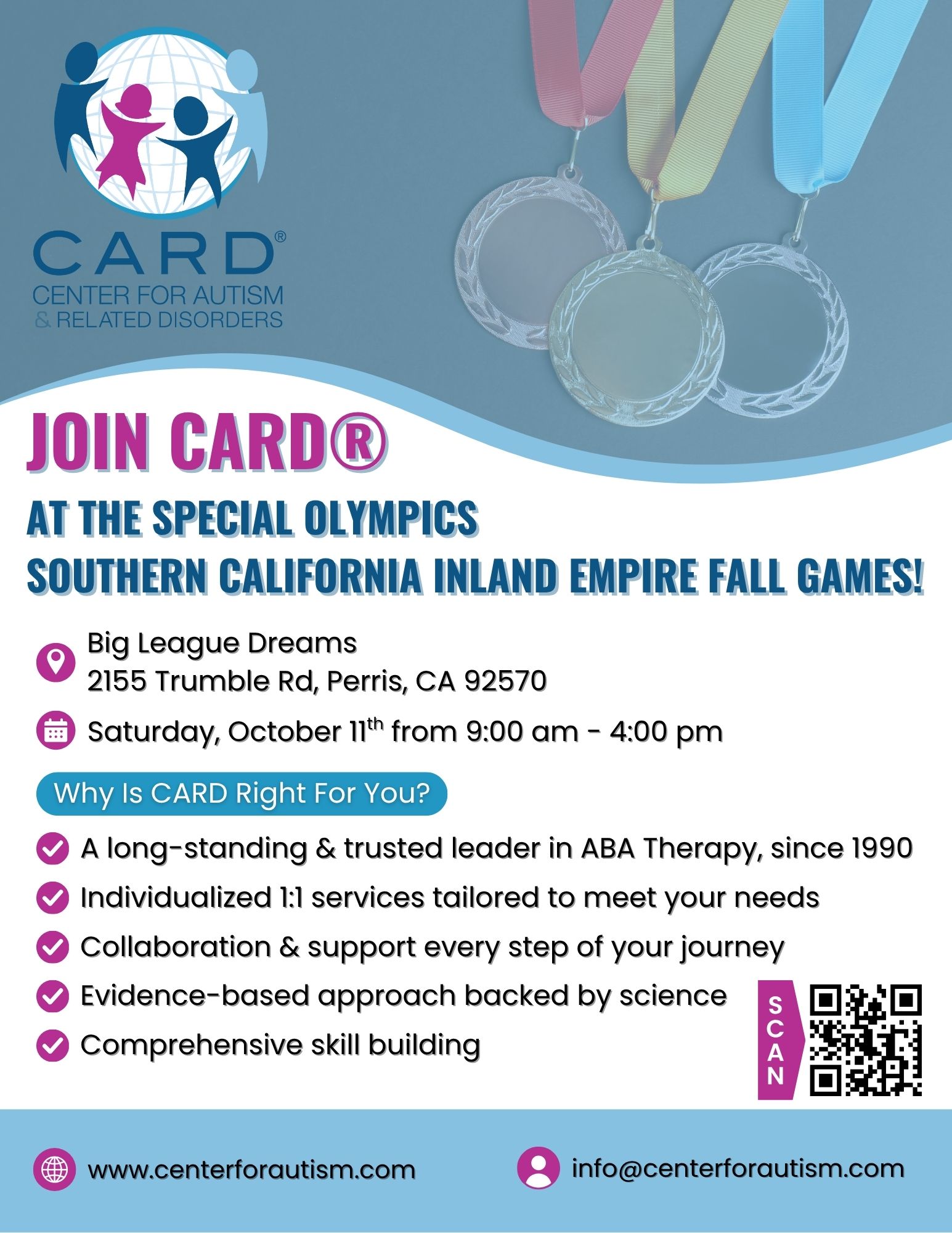 CARD is proud to be attending the Special Olympics Southern California Inland Empire Fall Games on October 11, 2025 at 9:00 AM at Big League Dreams! We can’t wait to cheer on the athletes, soak up the spirit of inclusivity, and be part of this inspiring day.