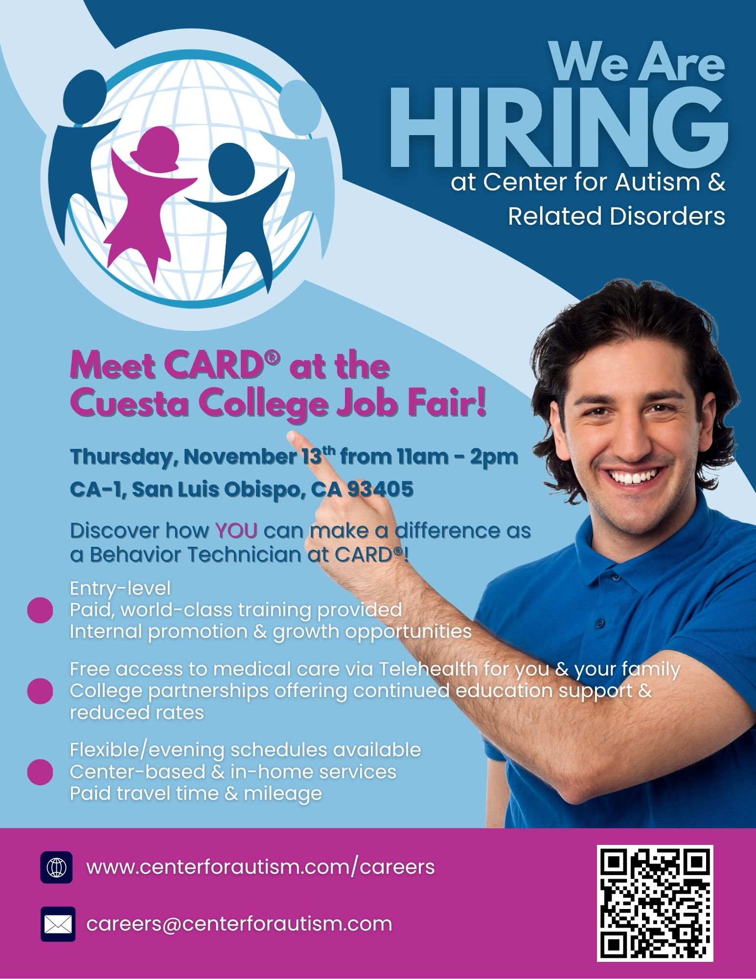 Hey Cuesta College! We’ll be at your Fall Job Fair on November 13, come meet the CARD team! Learn how you can become a Behavior Technician, get paid training, and start a career that changes lives through Applied Behavior Analysis (ABA). Stop by our booth to chat, grab resources, and find your next opportunity!
