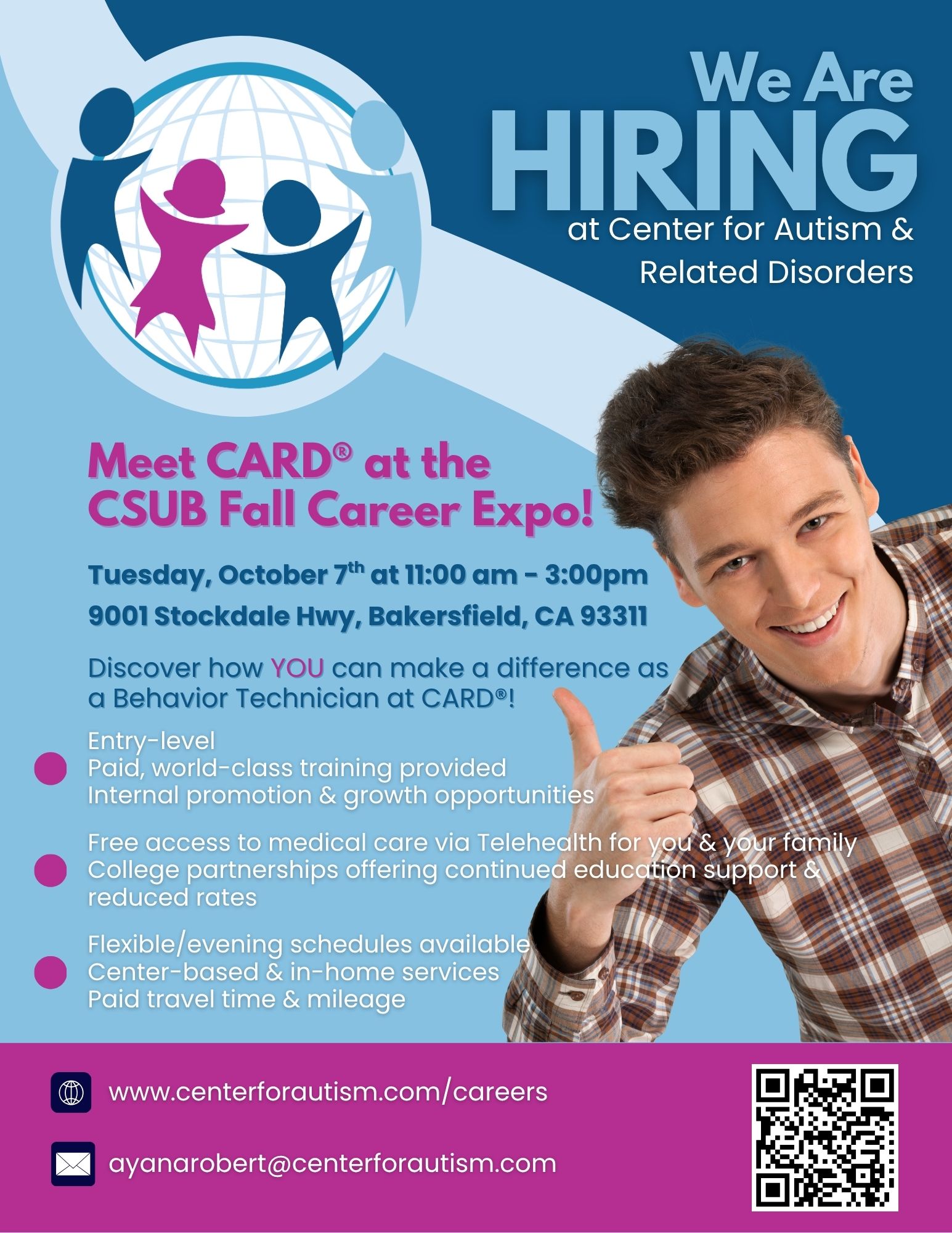 Meet CARD at the CSUB Fall Career Expo! We’re excited to connect with students at California State University, Bakersfield to share career opportunities as a Behavior Technician! Tuesday, October 7, 2025CSUB Fall Career Expo Paid training – no experience required Flexible schedules Career growth in ABA therapy Stop by our booth and discover how you […]