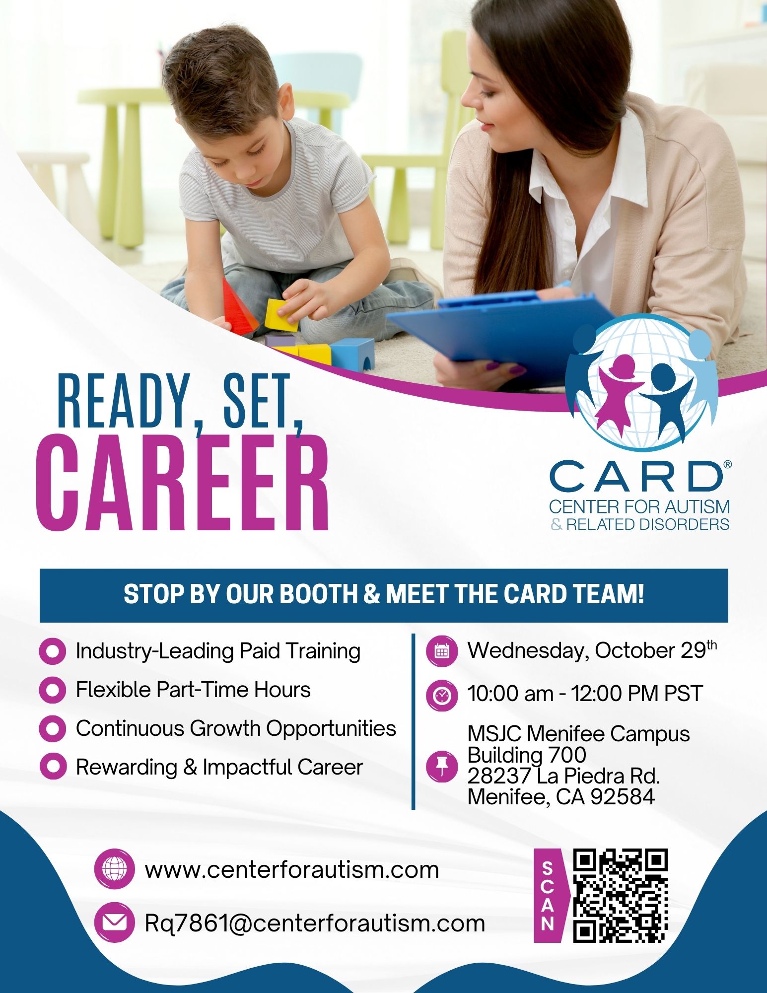 We’re heading to MSJC Menifee! Join CARD at the Ready, Set, Career: Assessing Career Readiness Fair to explore exciting opportunities as a Behavior Technician. Wednesday, October 29, 2025 10:00 AM MSJC Menifee Campus ✨ Paid training – no experience required ✨ Flexible schedules ✨ Career growth in ABA therapy Stop by our booth to learn […]