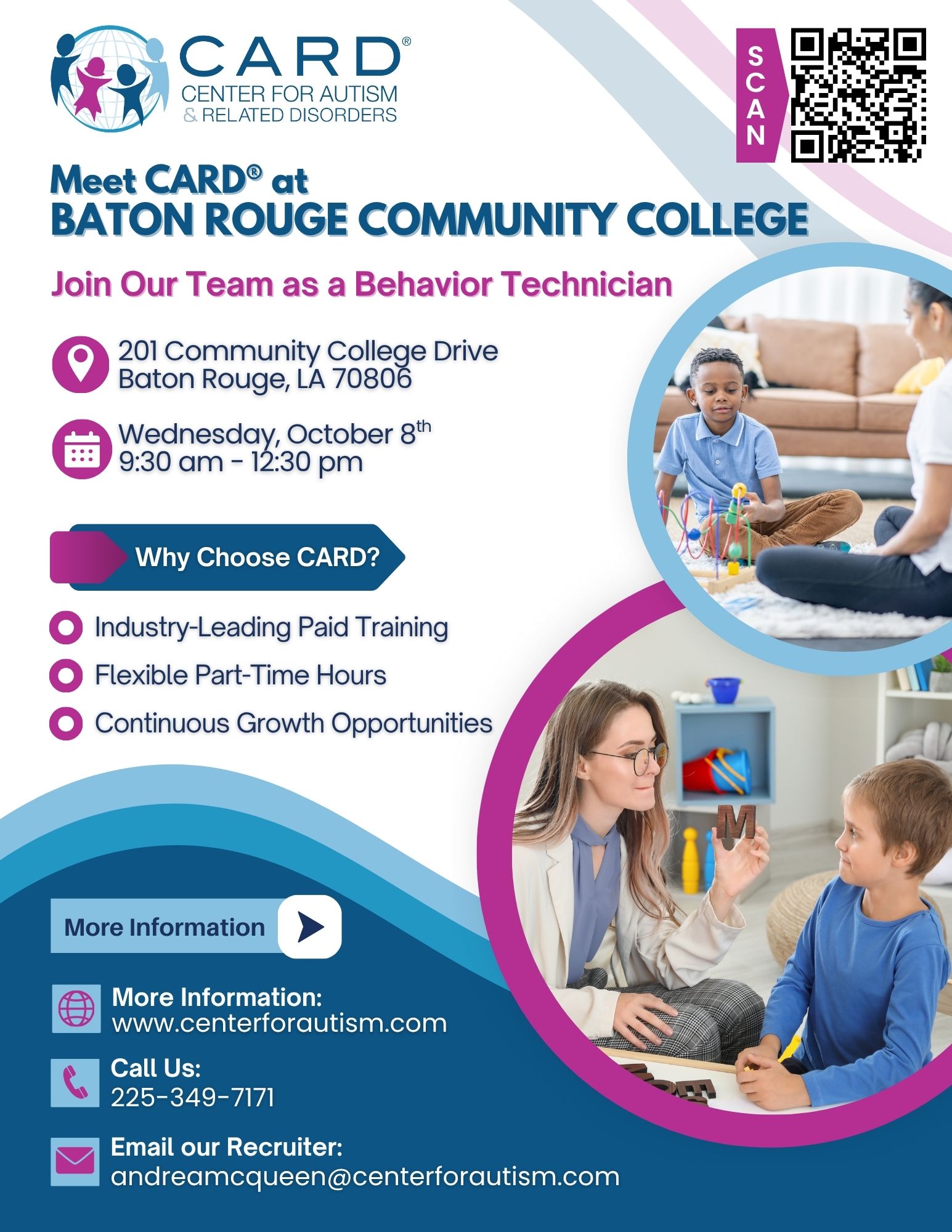 Catch CARD at BRCC! We’ll be at the Baton Rouge Community College Tabling Event on Wednesday, October 8, 2025. Come learn about starting a rewarding career as a Behavior Technician with CARD! Paid training – no experience needed Flexible schedules Career growth in ABA therapy Stop by our table and let’s chat about your future!