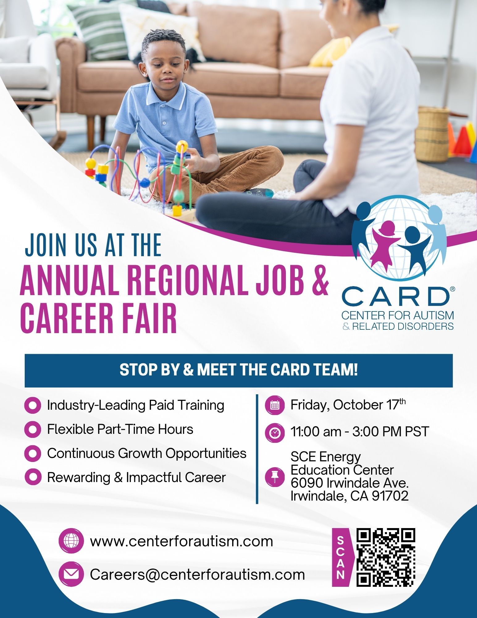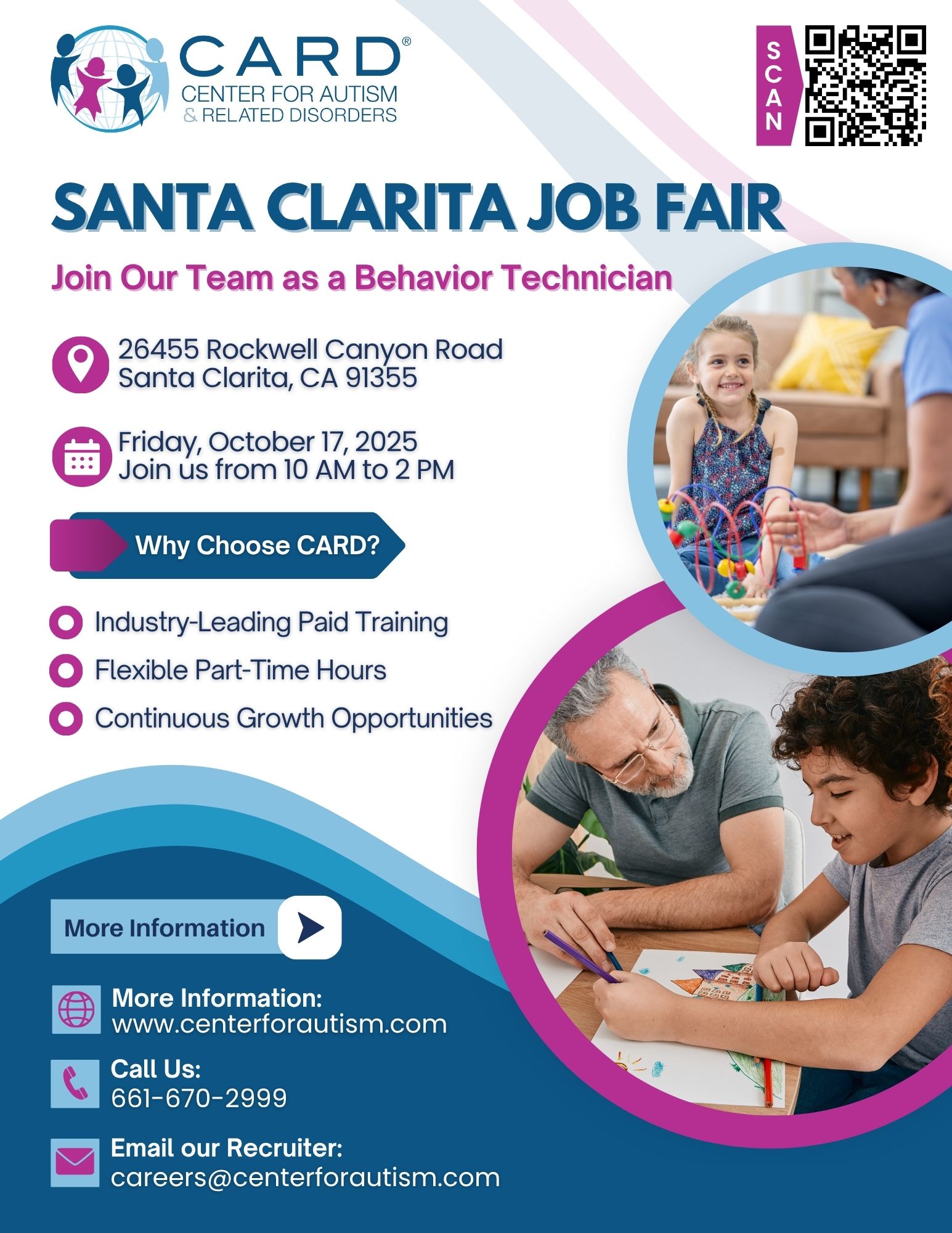 Join us for a Job Fair in Santa Clarita this Friday, October 17th, 2025 at 10AM! Come meet the CARD team and learn how you can make a difference working with incredible kids! Location: Valencia Campus 26455 Rockwell Canyon Road Santa Clarita CA 91355 Date: Friday, October 17, 2025 10:00 AM - 2:00 PM (PT)