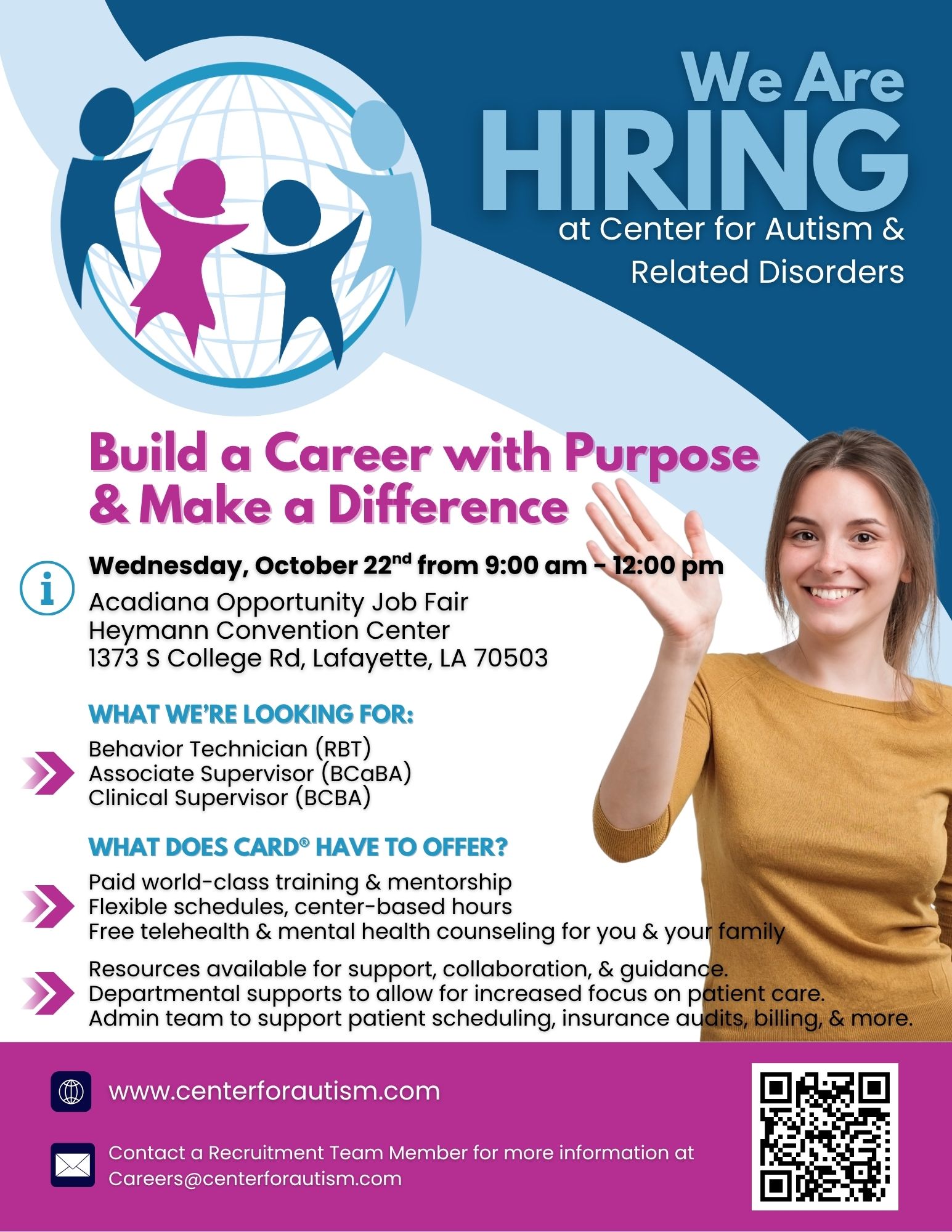Ready for a career that makes an impact? CARD is at the Acadiana Opportunity Job Fair in Lafayette, LA on October 22nd at 9 AM! Stop by our booth, meet the team, and see how you can join the CARD family!