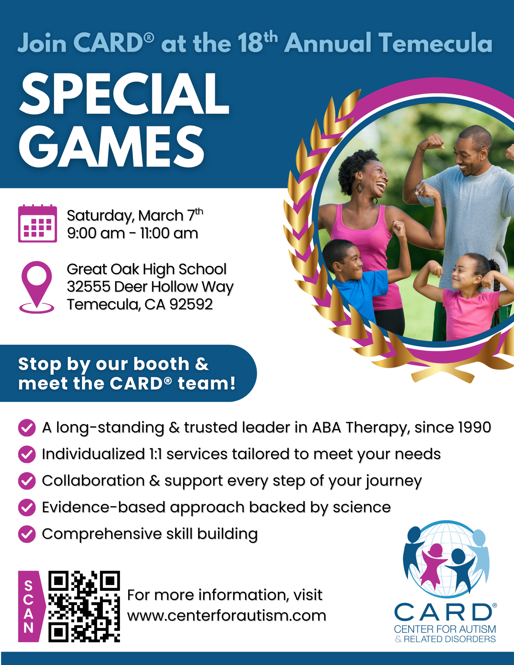 We’re excited to be part of the 18th Annual Special Games in Temecula, CA on March 7, 2026! This inspiring, family-friendly event celebrates inclusion, community, and abilities of athletes of all ages, with non-competitive games, a walk-a-thon, fun activities, music, and an awards ceremony for all participants. CARD can’t wait to join the celebration, cheer […] |
