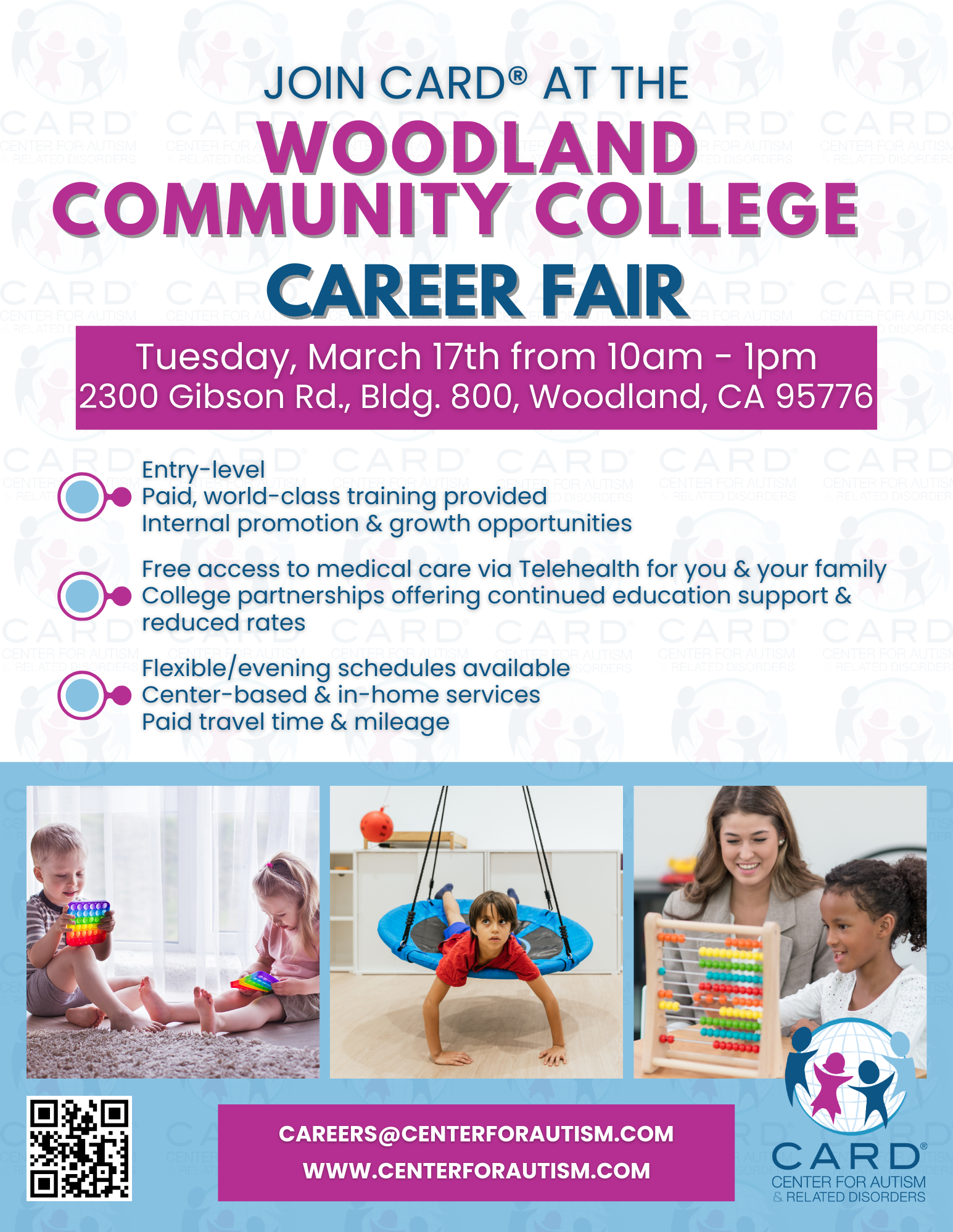 Woodland Community College, we’re coming your way! Join CARD at the Woodland Community College Career Fair on Tuesday, March 17th from 10am-1pm at 2300 Gibson Rd., Bldg. 800, Woodland, CA! Looking for a meaningful career with growth opportunities? We’re hiring for entry-level Behavior Technicians with:💙 Paid, world-class training📈 Internal promotion & growth opportunities🩺 Free telehealth […]