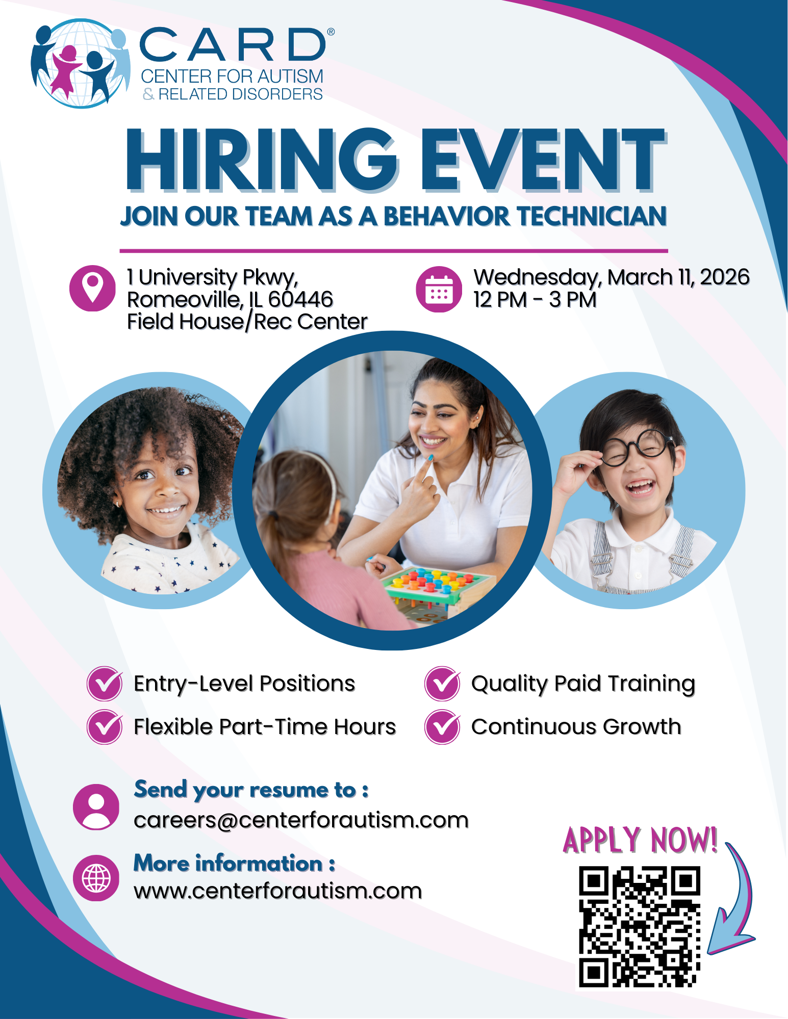 📍 Romeoville, IL — We’re Hiring! CARD is heading to the Career Expo Job & Internship Fair on Wednesday, March 11th from 12–3 PM — and we’re looking for passionate individuals ready to make a difference. 💙 Interested in a meaningful career in ABA therapy? Looking for hands-on internship opportunities? Come meet our team, learn […] |